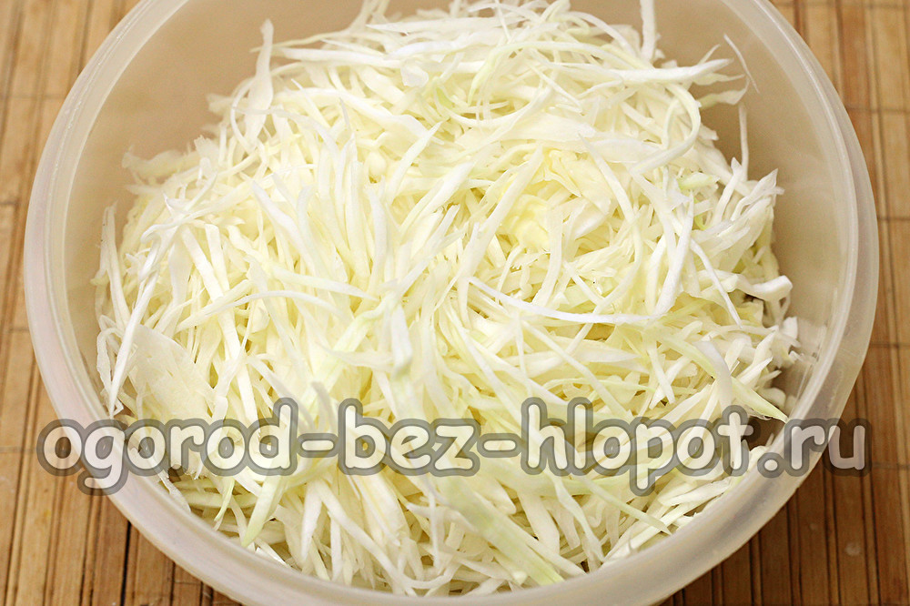 Почистваме зелето от увяхналите или повредени листа, изплакваме. Нарязваме наполовина, претриваме през шредер с не много дълга тънка сламка или нарязваме с нож.