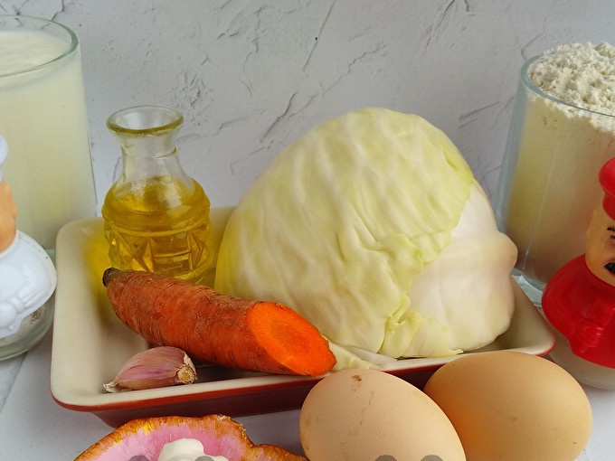 За пая ще ви трябват прости продукти, които винаги ще намерите в къщата. Тестото не изисква месене и дълго чакане, така че тази версия на пая със зелето спокойно може да се нарече мързелива.