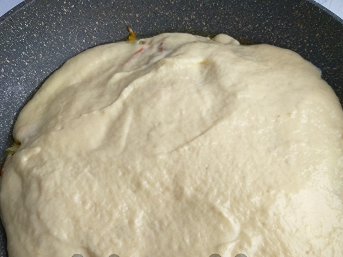 Намазнете тавичка за печене с олио и изсипете половината от тестото.