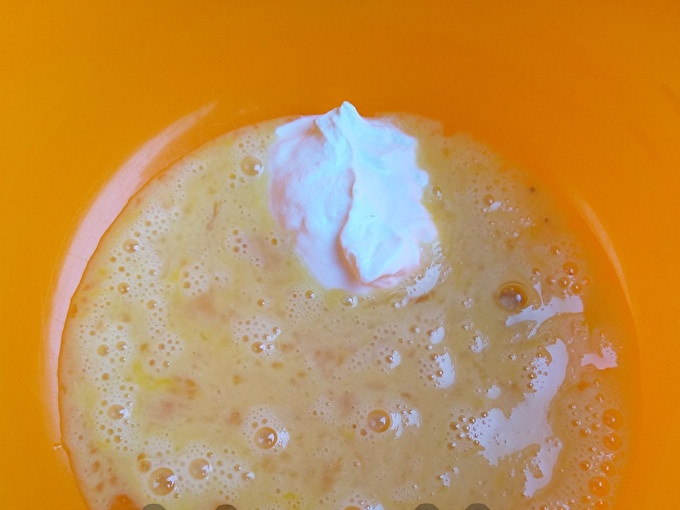 Разбийте яйцата със солта, добавете заквасената сметана и разбъркайте сместа.