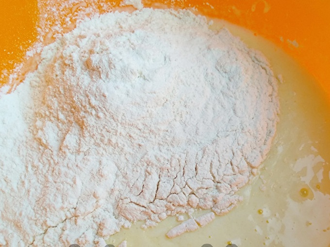 Изсипете брашно и разбъркайте масата.