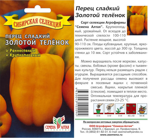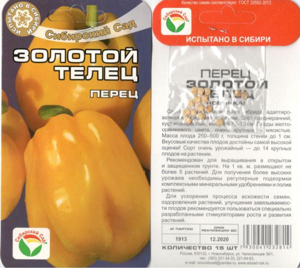- "Златен Телец" е сортов хибрид, който е специално пригоден за кацане в сибирски условия на открит терен. Храстите са ниски, 60-75 см. Плодовете приличат на бъчви, теглото им е 250-500 грама. Стените са дебели, до 10 мм. На едно растение се връзват до 14 чушки. „Златният Телец“ е много масивен, идеално подходящ за консумация в прясно и консервирано състояние.