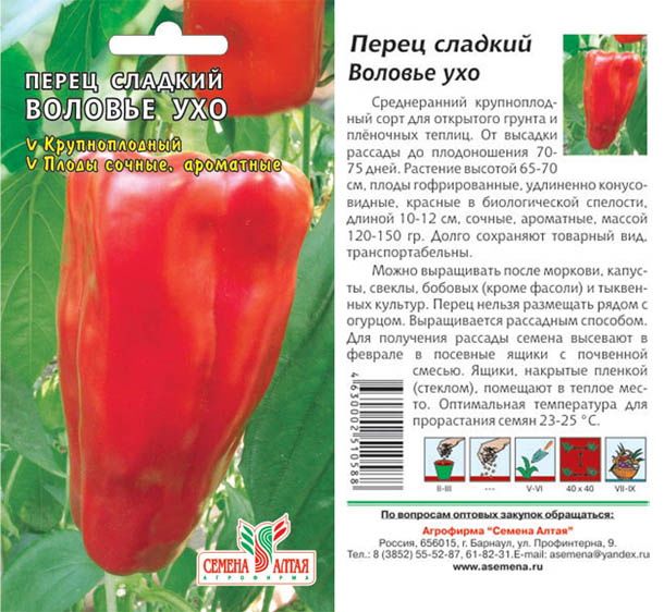 - Краве ухо. Компаниите Aelita и Altai Semen представляват този сорт като едроплодни чушки с отлични показатели за съхранение и транспортируемост. Плодовете достигат дължина 10-12 см. Най-малката маса е 100-120 гр., Най-голямата е 150-160 г. Растението расте 0,6-0,7 м. Пиперът започва да дава плодове 70 дни след трансплантацията.