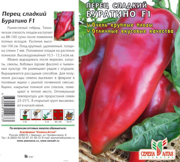 - „Пинокио“ е разновидност на пипер с удължена плодова форма с дължина 12-15 см. На храстите, с височина 0,7-1 м, растат конусовидни чушки с тегло 80-120 грама. Привлечена от външния си вид, способността да съхранявате зеленчуци за дълго време и да транспортирате на дълги разстояния. Зрелите зеленчуци имат стени с дебелина 4-5 мм.