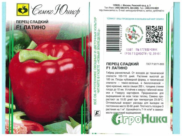 - "Latino" - сорт пипер, който се приписва на хибриден произход. Препоръчва се да се отглежда на затворена почва. Височината на храстите достига 100 см, растенията са среднолистни, но листата са големи. Плододава добре. Пиперът расте с тегло 200 грама със стени от 10 мм. От 1 м² при всички условия на засаждане и грижи можете да съберете 14 кг. зеленчуци.