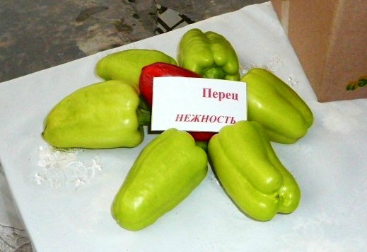 - Пипер "Нежност" няма да ви изненада с червения си цвят, но ще зарадва дебелите стени от 7-8 мм., Теглото на плода е 110-130 грама. От един квадратен метър можете да съберете 7-10 кг. Такава производителност се оправдава с височина на растението от 1 m или повече. Пиперът трябва да бъде вързан към опора.