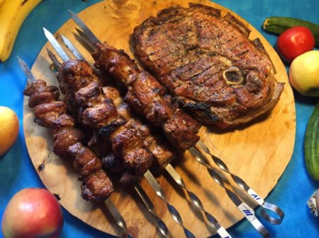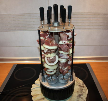- нанижете 5-6 парчета свинско месо върху всяко метално приспособление;