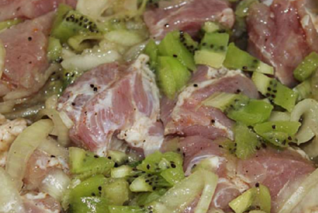 Кивито съдържа специфични ензими, които разграждат месните ензими много бързо. Ето защо, когато мариновате, не добавяйте този плод повече от препоръчителната доза и ферментирайте месо за по-дълъг от посочения период. Тъй като вместо ароматни пържени парчета месо с хрупкава коричка, можете да получите месо от пюре. Следвайки рецептата, можете да получите сочно и меко ястие с пикантна киселинност, дори без да добавяте подправки.