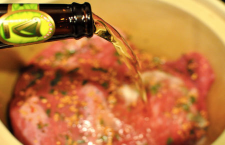 - поставете разбитото месо в съд от 4 l-5 l, изсипете бира, така че парчетата да бъдат напълно покрити, но да не плават в течността;