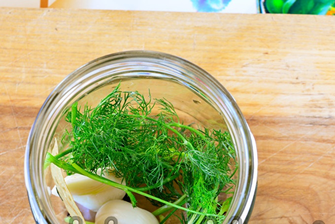 В дъното на чист буркан ще изпратим всички подправки: дафинови листа, копър, обелени скилидки чесън и черен пипер. Ако харесвате пикантни храни, тогава сложете резен лют червен пипер на дъното на буркана - това ще направи тиквичките по-чубрица.