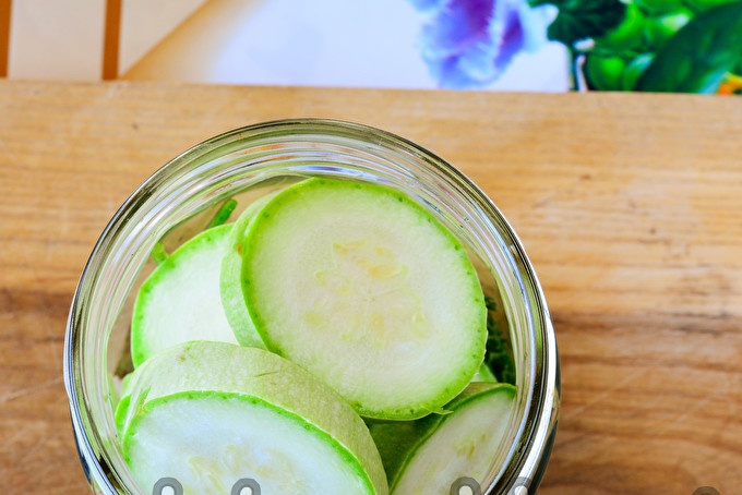 Тиквичките нарежете на кръгчета с дебелина не повече от 1 см и сложете на слоеве в буркан с подправки.