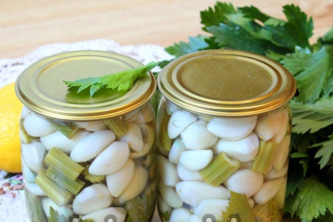 За марината чесънът трябва да се нарязва на ситно и да се поставя в тенджера. Горчицата и подправките се разпространяват там, след което се налива 1 литър вода и се слага на печката. Саламурата се вари около 7 минути, след това се добавят оцет и зехтин и се варят още няколко минути.