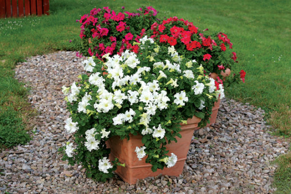 Отличително разнообразие от едри цветя е „Deaddy“. Грандиозно оцветяване, съчетано с тъмни вени на червен фон, изглежда органично и елегантно. Picoti съчетава лилав тон с широка бяла рамка. Контрастните вени на „Hulahup” и „Prisms” добре ще подчертаят модните тенденции на тази година. Класическото бяло оцветяване се характеризира с парада Хитун и перуниите от Афродита. „Двойната каскада“ има специални махрусни венчелистчета. Лавандуловите тонове ще помогнат за разнообразяване на цветната градина.