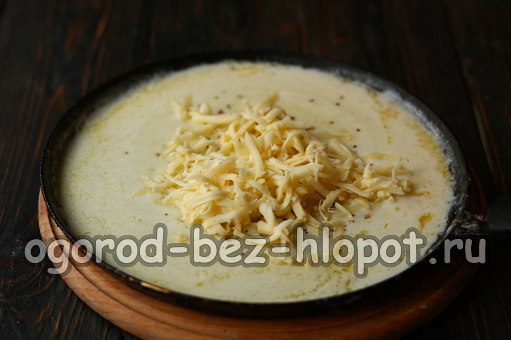 Добавете настърган кашкавал (около 3 с. Л.), Разбъркайте. Сиренето ще се разтопи от топъл сос.