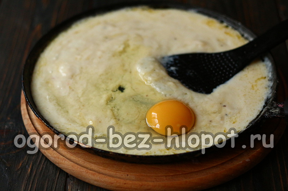 След 5-7 минути, когато бешамелът се охлади малко, вкарайте яйце в него.