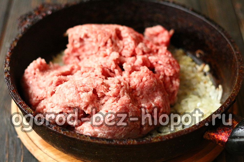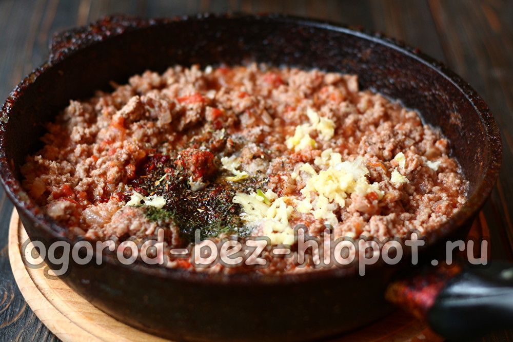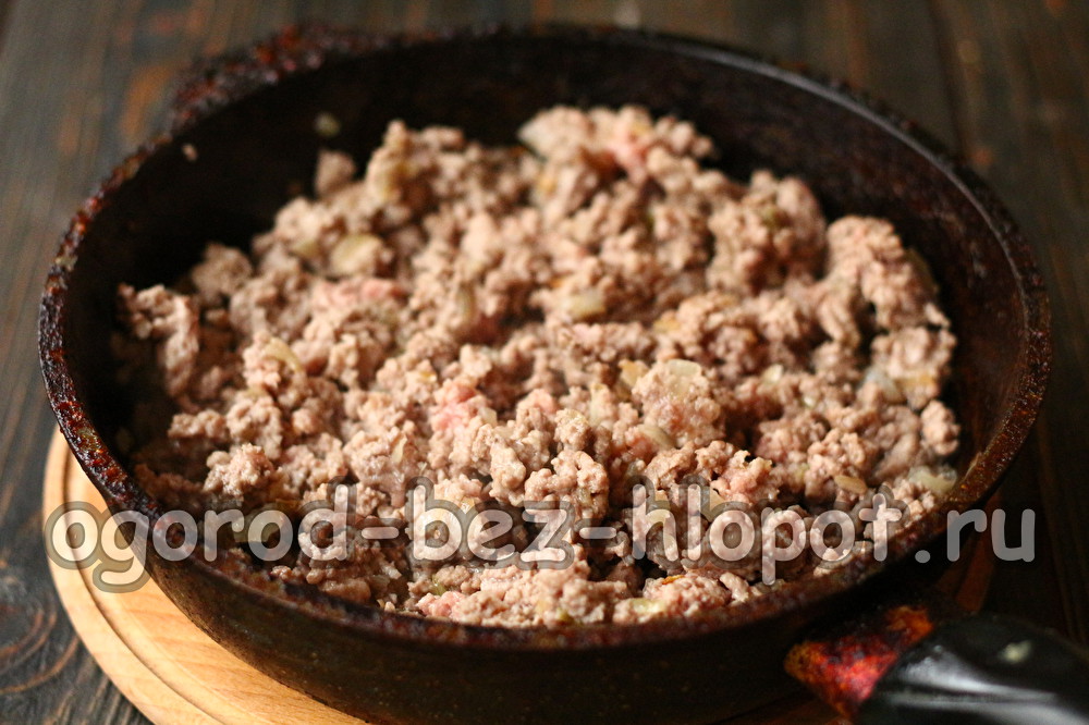Гответе на среден огън, като разбърквате и разбивате бучките кайма с шпатула.