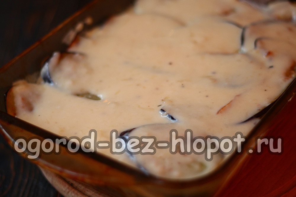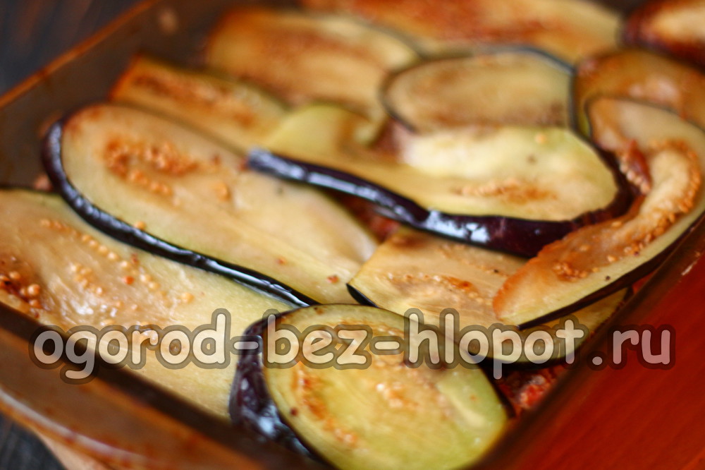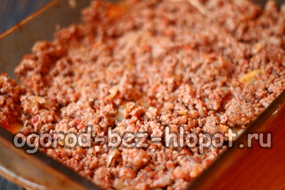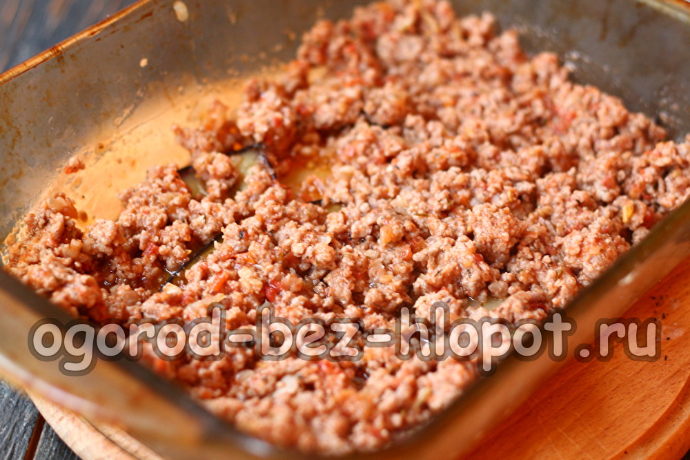 Поставете компонентите на мусаки в термоустойчива форма на слоеве. Първият слой е половината от патладжана.