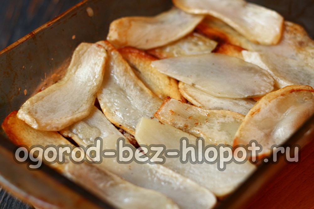Междувременно нарежете патладжана и обелените картофи на тънки филийки.