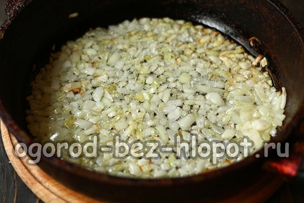 Пържете до прозрачен и лек златист оттенък, като използвате растително (за предпочитане зехтин) масло.