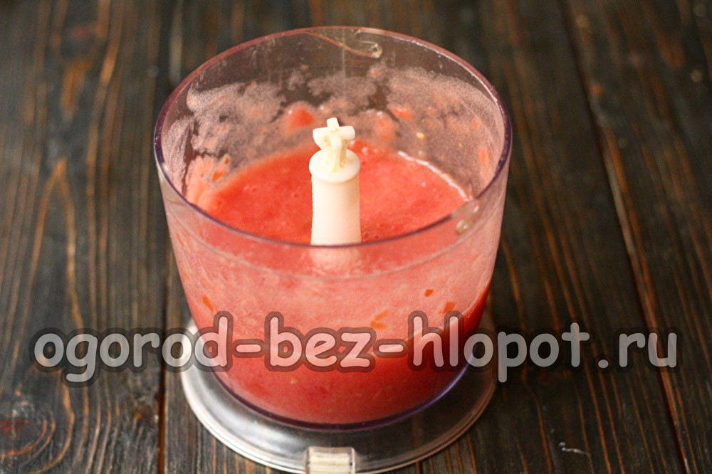 Едновременно с печенето на кайма пригответе доматено пюре. За да направите това, бланширайте (задръжте за 2 минути във вряща вода) домати, охладете под чешмата, отстранете кожата. Едро нарязани бланширани домати и поставете в блендер.