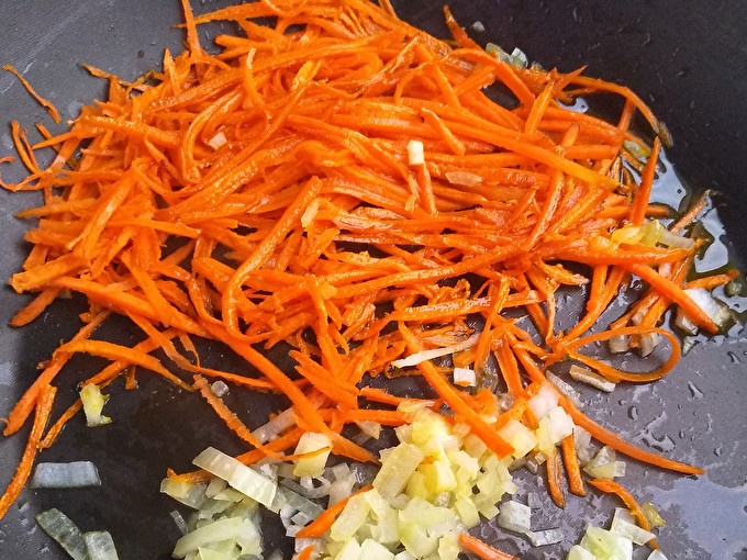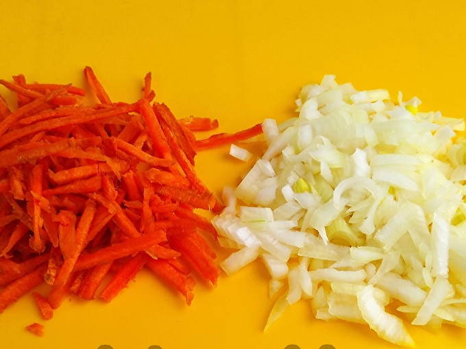Настържете моркови за корейски зеленчуци. Обелете и нарежете лука.