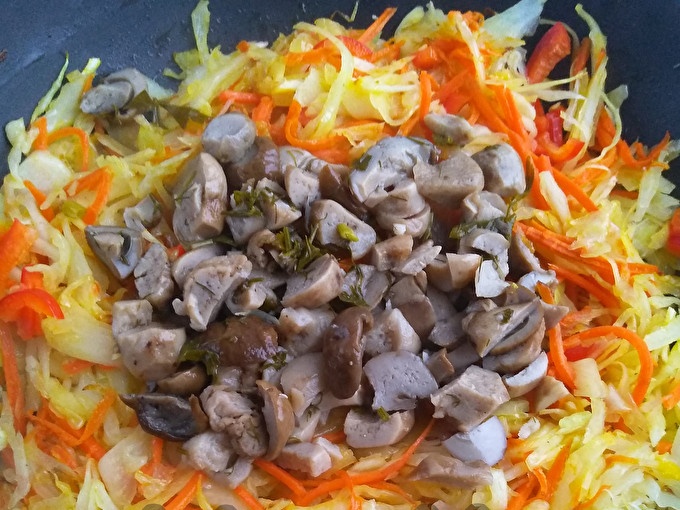 Сложете нарязания пипер отгоре на зелето, продължете готвенето под капака.