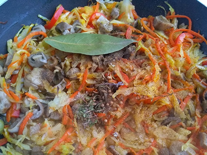 Добавете сол, черен пипер, подправки и гответе още 3 минути под капака.