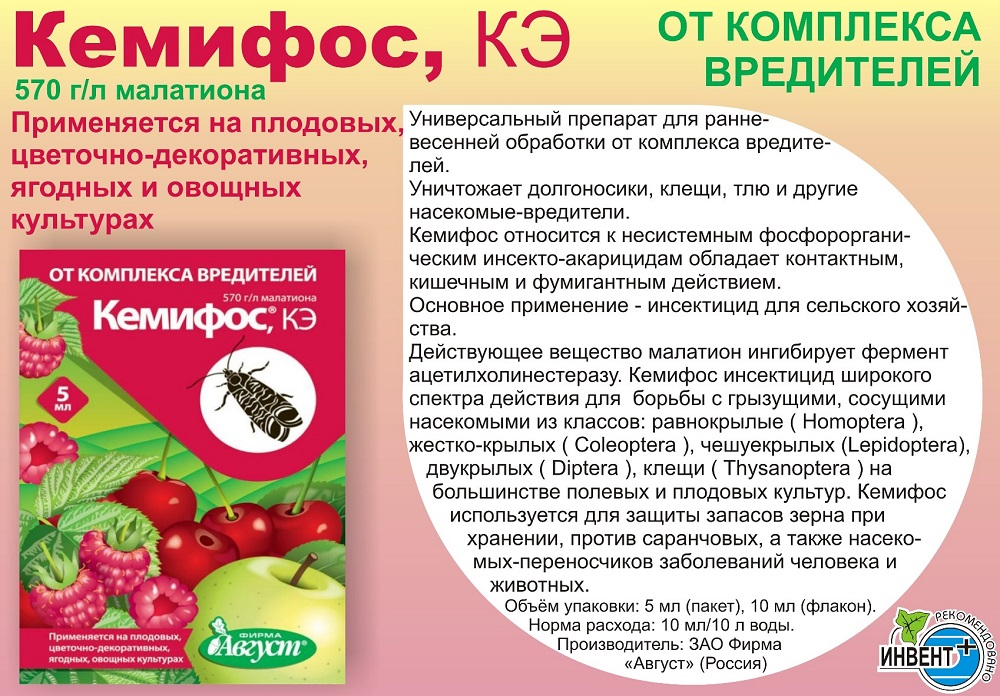 Използва се за унищожаване на насекоми вредители на градински и овощни култури. Лекарството е чревно и контактно действие. Защитен ефект - до 15 дни, но е необходимо многократно приложение