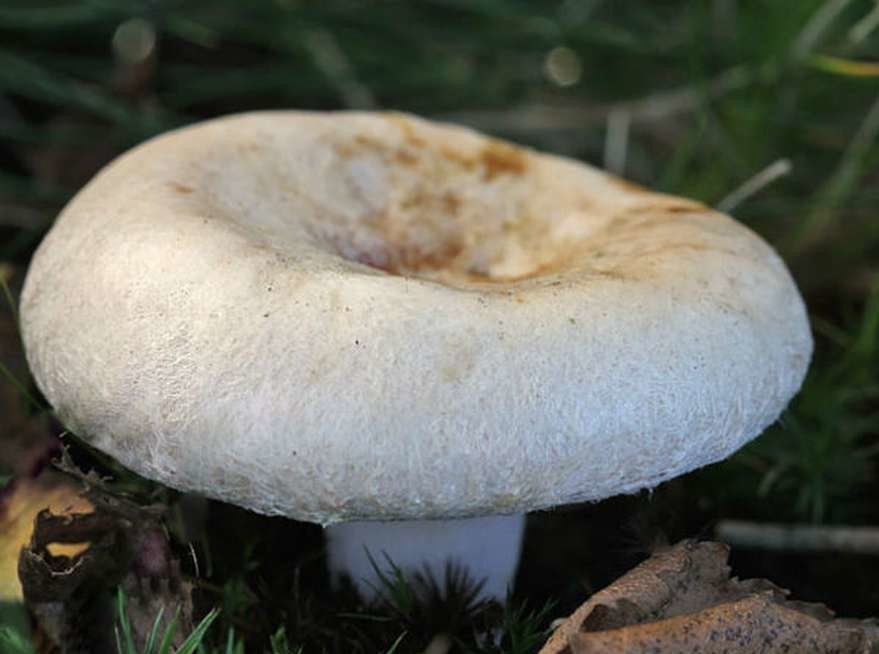 Шапката на плода е боядисана в бяло и нараства до 12 см в диаметър. Центърът е депресиран, а краищата са обърнати навътре, които се разгъват, докато гъбата расте. Възрастните плодове често имат шапка с форма на фуния, която се оформя в онези екземпляри, които живеят на сравнително открити места. Концентричните кръгове са много слабо изразени, така че са почти невидими. В центъра на шарената шапка можете да видите тъмна зона. Презрелите гъби стават жълтеникави.