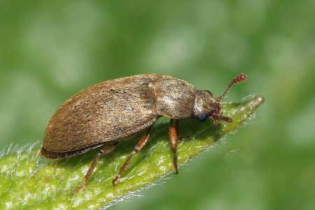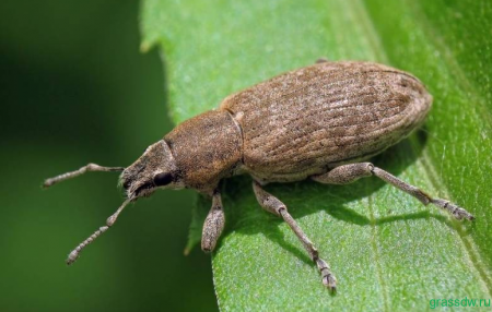 Ларвите кукуригат в паднали цветя, в средата на юни от тях се появява малък черен бръмбар с удължен чучур. През целия сезон вредителят ще даде 2 или 3 поколения, първите 2 ще ядат листа, стъбла и цветя. Превенция и лечение: