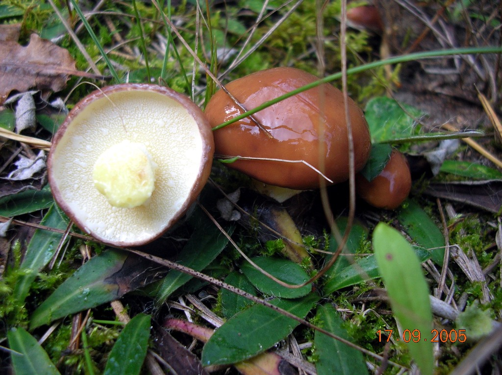 Корите се отделят лесно от пулпата. Цилиндричният крак расте на 5-10 см височина. Долната част на краката е боядисана в тъмни цветове, а горната част е бяла. Плътна каша с бял цвят с жълтеникав оттенък. Точката на рязане става виолетова или червена.