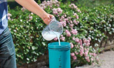 Предварителните изчисления показват, че трябва да се приемат около 10 кг урея на 10 литра вода.Съставът се смесва и се филтрира през марля тъкан 2-3 пъти.