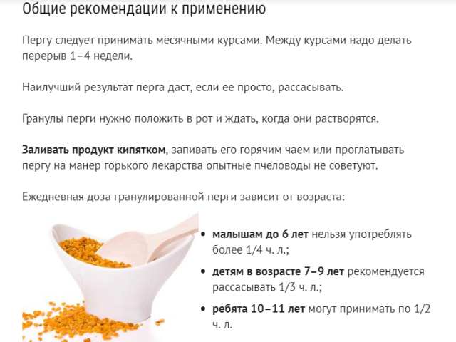 Всеки ден е позволено да се консумират 10-30 g от продукта; излишната доза може да доведе до негативни последици.Просто трябва да поставите зърнестия прашец в устата си и да го разтворите за няколко минути.