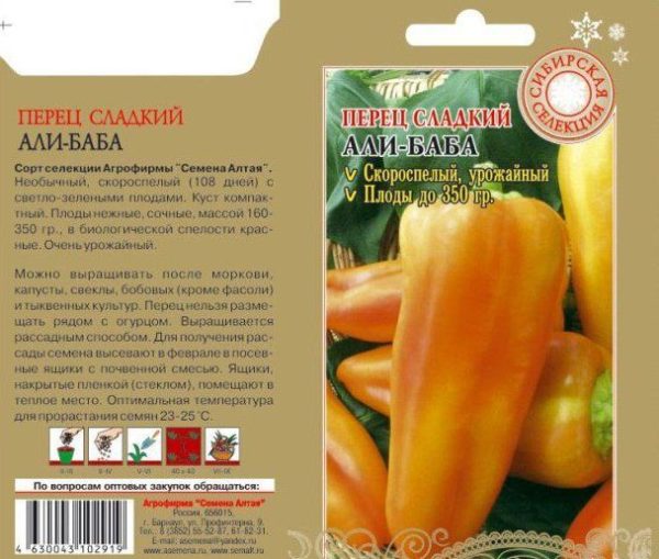 Този сорт е разработен от руски животновъди, които са взели предвид особеностите на местния климат, така че растенията дават сочни, вкусни и големи плодове във формата на конус. Сладките чушки „Али Баба” са особено ценени поради високите си добиви и по-компактния размер на храста.