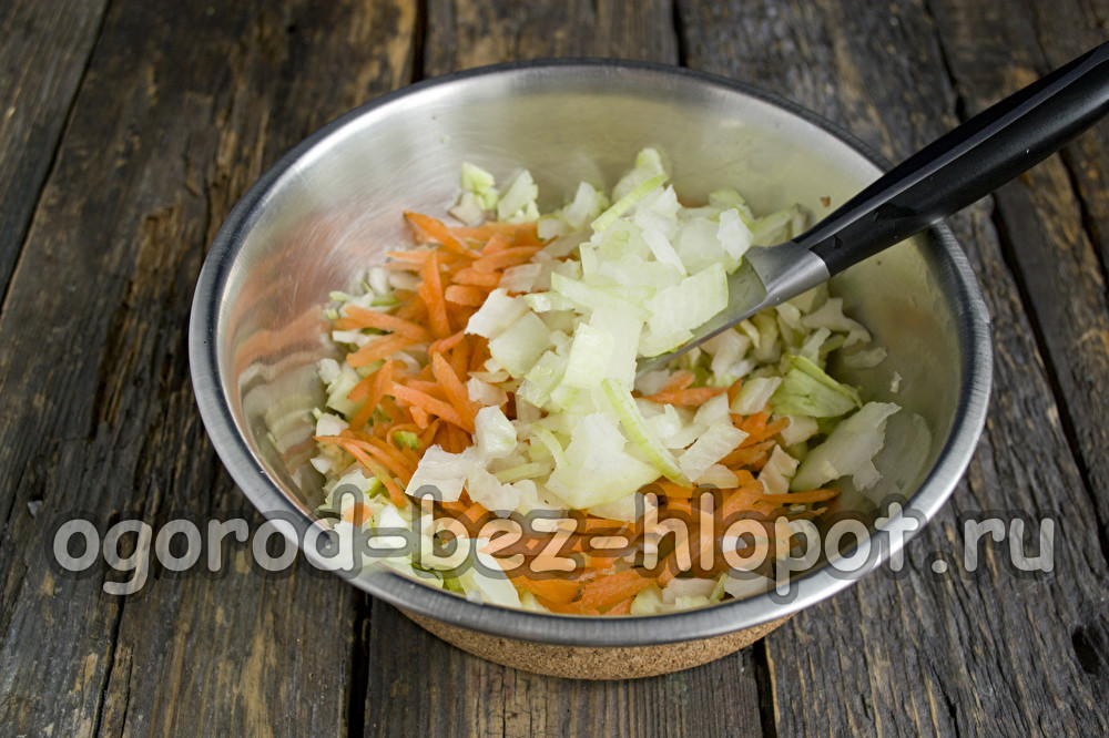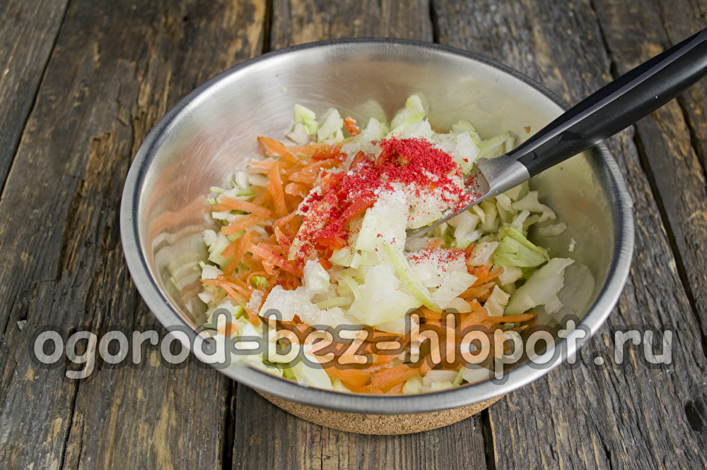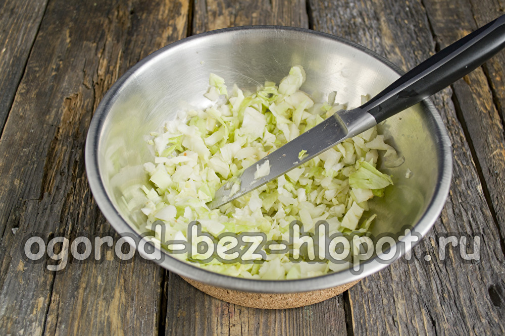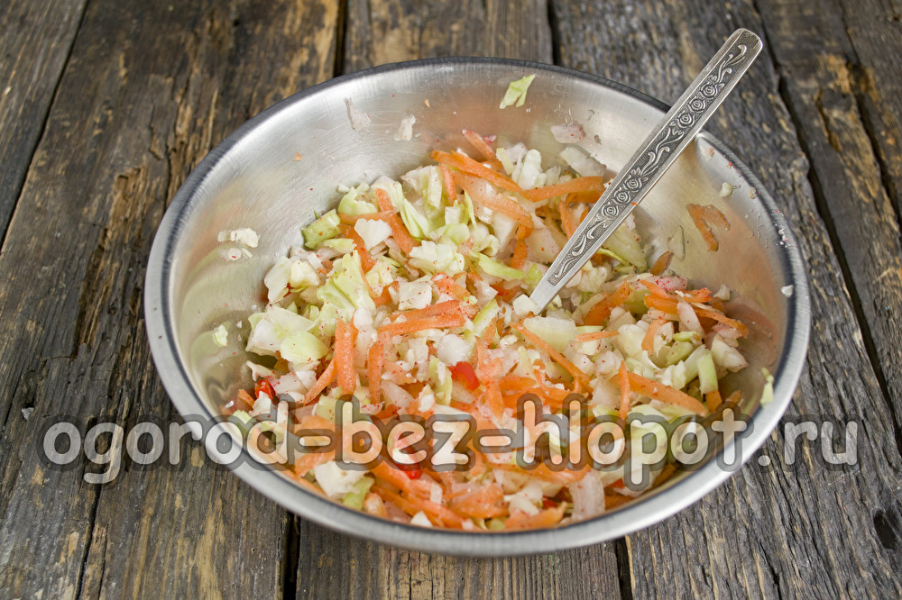 Номерираме лука, нарязваме на ситно, добавяме към зелето и морковите.