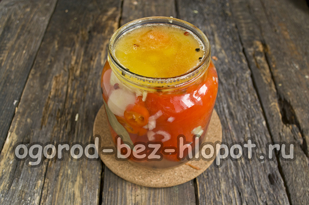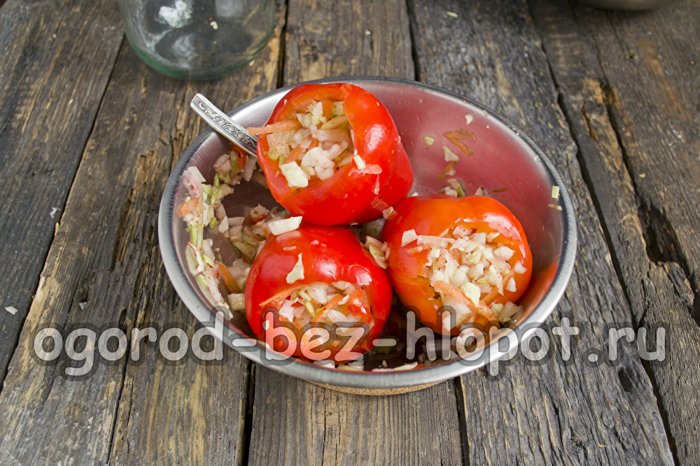 Слагаме зеленчуците в буркани, заливаме с вряла вода, оставяме за няколко минути да ги затопли.