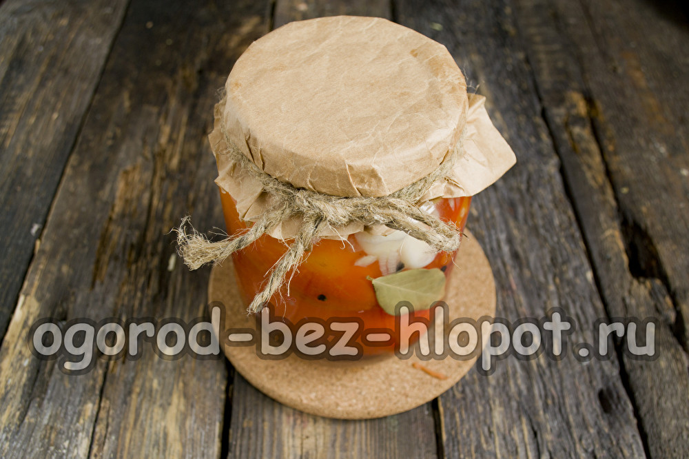 Покрийте с капаци, стерилизирайте литрови буркани за 12 минути. Ние плътно закопчаваме, след охлаждане я изваждаме в хладно килерче.