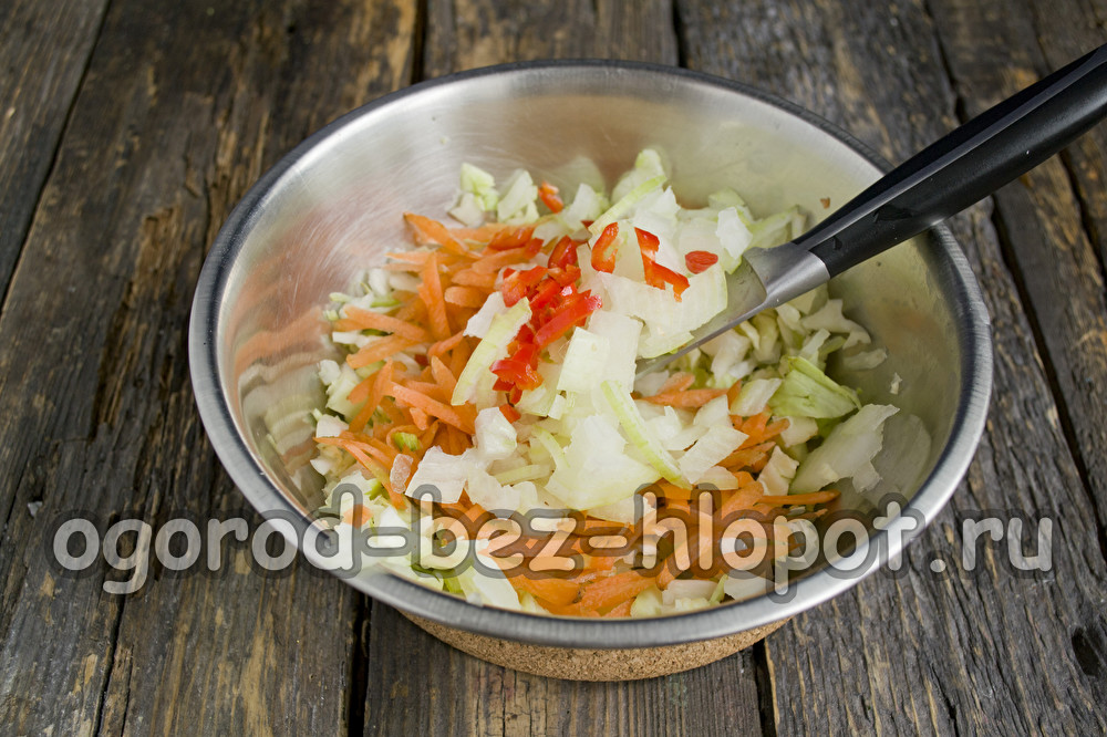 Чили шушулки се почистват от семена, нарязват се на кубчета, добавят се към нарязани зеленчуци.