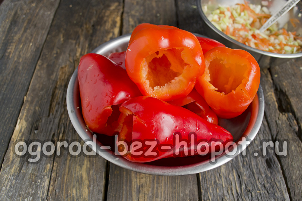 Изчистваме семената от шушулките на червен пипер. По-добре е да използвате малки плодове, удобно е да пълните литрови буркани с такива зеленчуци.