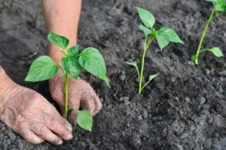 В същото време почвата, запазена за засаждане на храсти от сладък пипер, трябва да бъде плодородна. Ето защо, по време на есенното копаене, си струва да добавите пресен оборски тор. Ако това не е направено през есента, тогава по време на засаждане на разсад по две шепи изгнил тор и шепа дървесна пепел се добавят във всеки кладенец.