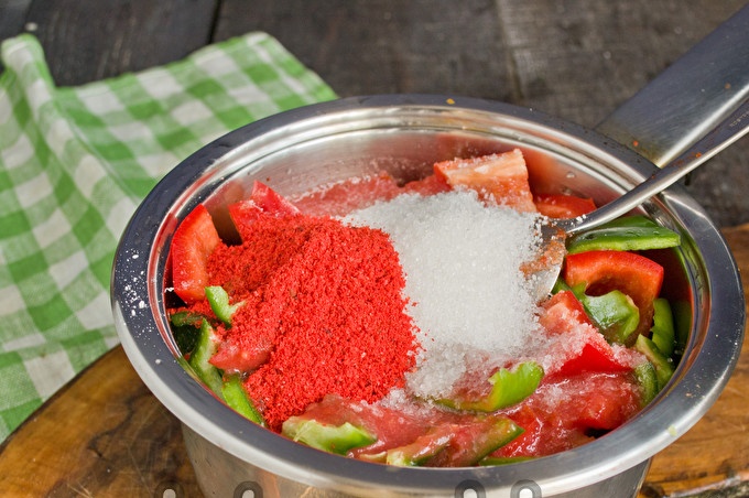 Добавете смлената сладка червена чушка, изсипете захар и трапезна сол, налейте малко ябълков оцет. Слагаме тигана на печката, затваряме капака, довеждаме зеленчуците до кипене на силен огън. След това свалете капака, изключете газа, гответе 20 минути.