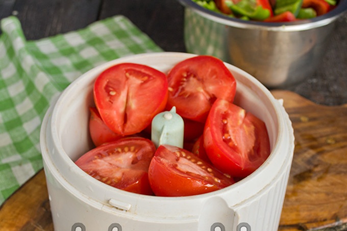 Смелете зрели, червени домати в блендер до гладкост. Доматеното пюре може да се филтрира, за да се отървете от семената, но ако семената не ви притесняват, тогава това не си заслужава.