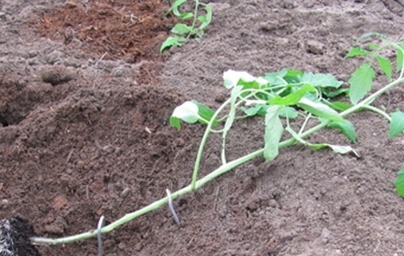 - засадете растението в легнало положение, задълбочавайки стъблото, така че да остане върхът от 20-30 см;
