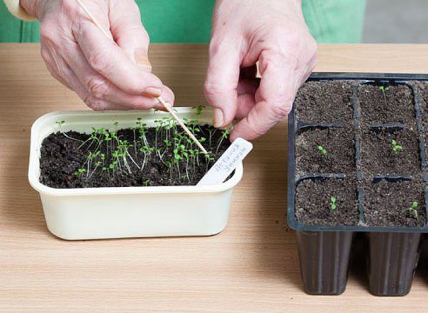 За да извършите тази процедура и да получите красиви петунии цветя на отглеждане на семена у дома, прищипването е твърде рано, но пресаждането на растението на друго място няма да навреди. Ако не пресадите, тогава в крайна сметка растенията ще започнат да приемат ценни полезни вещества един от друг, което ще доведе до смъртта на всички разсад. Така че кълновете да не потискат един друг, за всеки си струва да подчертаете малък съд с почва. За да направите мотика, не е необходимо да се прави на ръка, тъй като кълновете са твърде крехки и малки, най-добре е растенията да се трансплантират в земята с кафена лъжичка или специална шпатула за стайни растения.