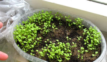 Благодарение на такава система растенията ще бъдат постоянно в условия на висока влажност и няма да се налага да се поливат твърде често. Също така онези семена, които току-що са започнали да покълнат от семена, няма да се нуждаят от поливане, което означава, че всеки кълнове ще има право на живот. Много е важно след първите издънки контейнерът да бъде поставен в топла стая с добро осветление, дори може да бъде перваза на прозореца, но температурата на въздуха не трябва да бъде по-ниска от двадесет и три градуса.