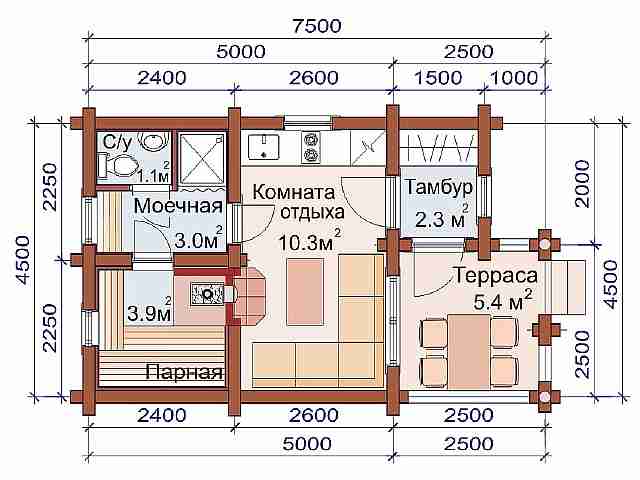 Когато проблемът с мястото е решен, струва си да помислите за самия проект. Планът отразява такива параметри като броя и предназначението на помещенията, размера на отделенията за парно и миене, наличието на допълнителни отделения, брой етажи.