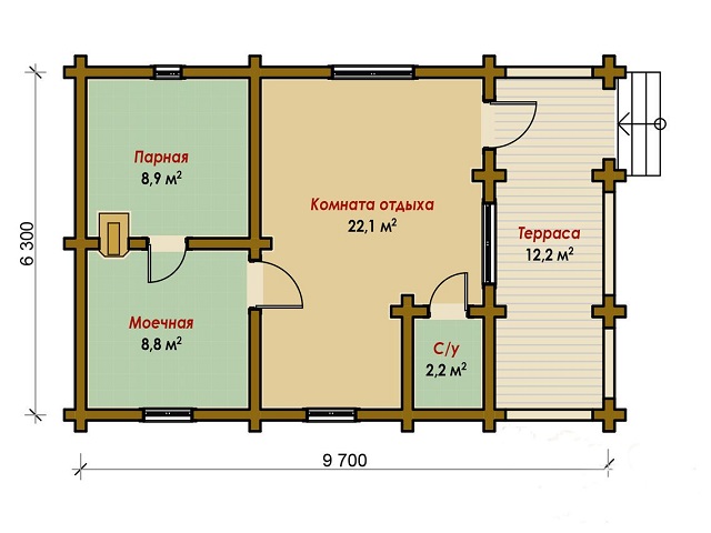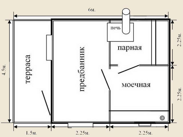 Независимо от размера на площта, която се планира да се използва за изграждането на къщата за баня, трябва да се вземе предвид наличието на традиционни помещения. Тези отдели включват парната стая, отделението за миене и помещението за релакс между приемите на пара.