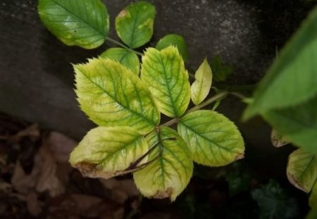 | манган | Появата на листата между вените на жълти ивици. Най-често недостигът на елементи се наблюдава при стареещи храсти. |