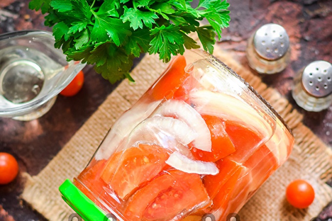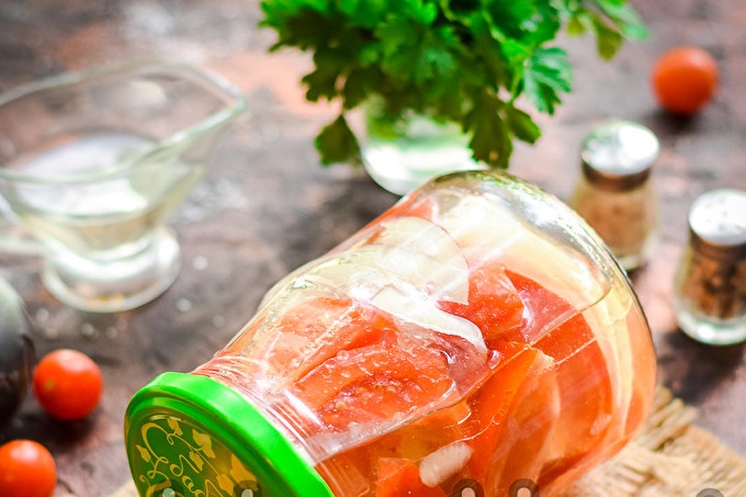 Докато беритбата на зеленчуци и салати е в разгара си, стюардесите се опитват да направят разнообразните си запаси. Ако също принадлежите към пестеливите стюардеси, ето една рецепта, която да опитате - домати с резенчета лук и олио за зимата. Рецептата е без стерилизация, виждате, това значително опростява процеса.