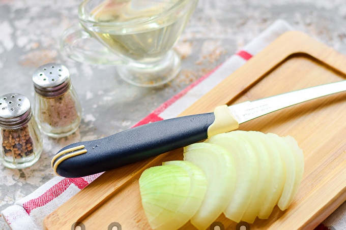 Обелете лука със среден размер, изплакнете, подсушете. Лукът се нарязва на половин пръстени със средна дебелина.
